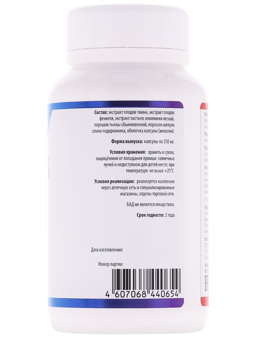 Состав: экстракт земляники лесной, экстракт фенхеля, экстракт тмина, порошок подорожника блошного, порошок тыквы.