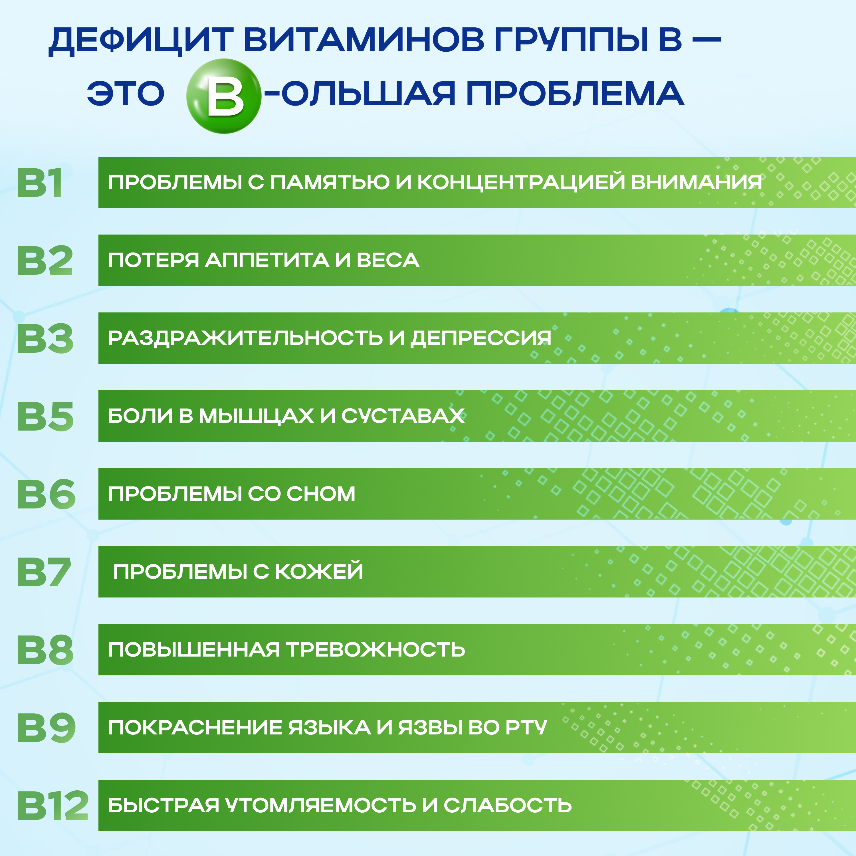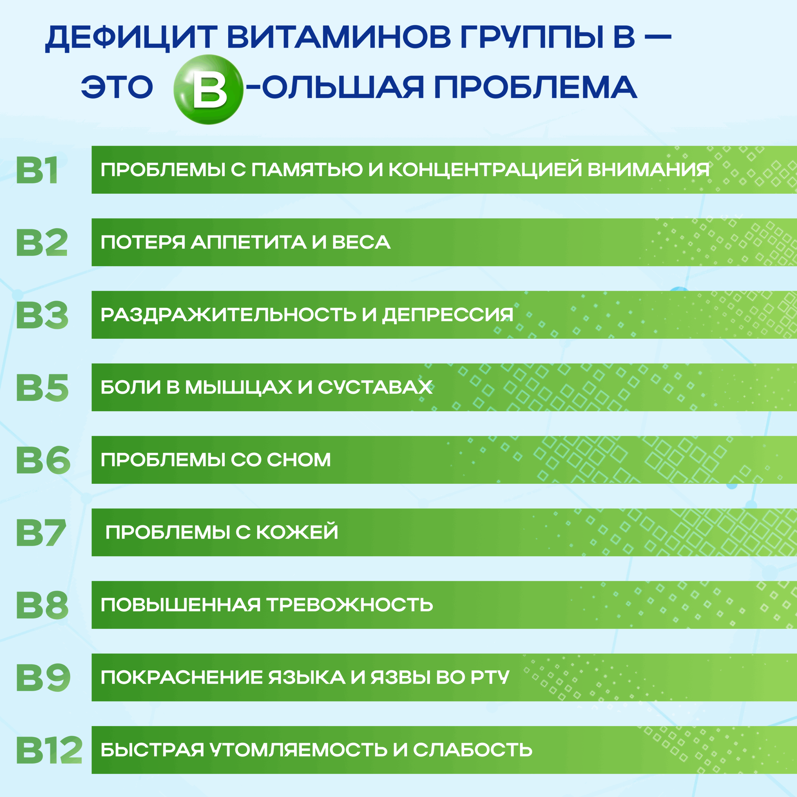- B9: Утомляемость, язвы во рту, риски пороков развития у плода.